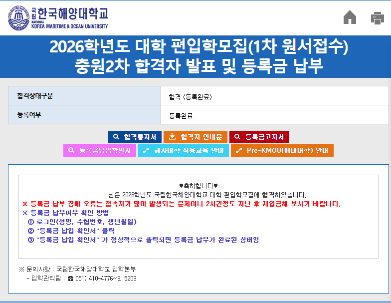 • 편입 합격 결과 2026학년도 한국해양대 합격