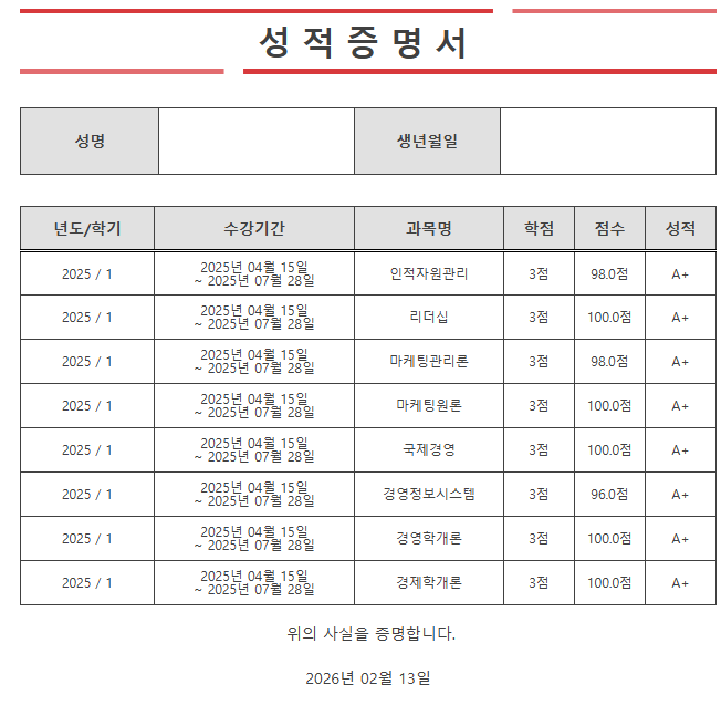 • 달성 성과 전 학점은행제 과목 평균 4.5 (A+) 달성 🏆